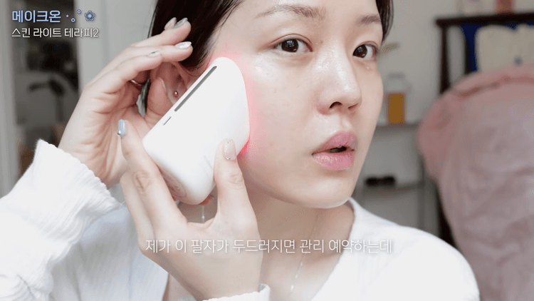 저는 좁쌀 트러블 스트레스가 정말 많았는데 이것으로 다 개선했어요. 메이크온의 스킨 라이트 테라피 2입니다. 최근에는 3분이면 되는 더 간편한 제품을 사용하고 있는데, 넓은 헤드로 몇 번만 왔다 갔다 하면 되어서 정말 편합니다. 이 제품은 윤곽 관리에 진짜 효과를 많이 봤어요. 2주 정도 사용했는데 실제로 리프팅 효과를 많이 느꼈습니다.