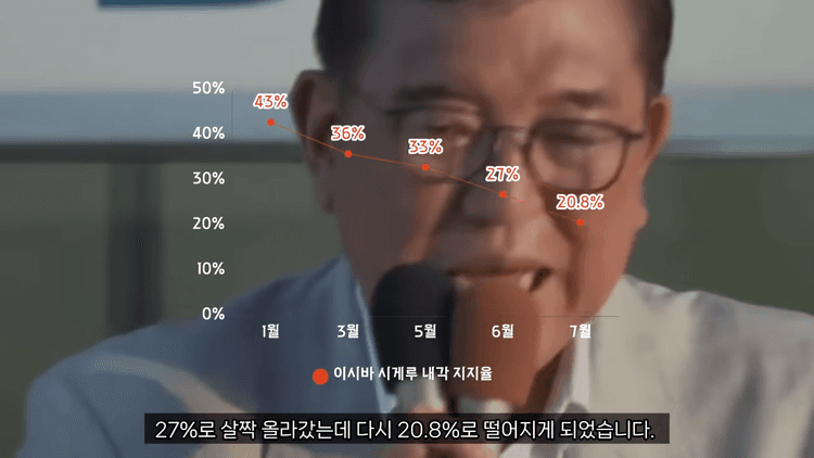 이와 더불어 이시바 총리에 대해 큰 반감을 품는 여론이 늘어났습니다. 이시바 총리의 지지율은 현재 20.8%로, 이시바 내각 발족 이래 최저치를 기록했습니다. 6월에응 우리나라에서 ‘펀쿨섹좌’라는 별명으로 유명한 고이즈미 신지로가 농림수산성 대신으로 취임하면서 27%로 살짝 올라가기도 했지만, 다시 20.8%로 떨어지게 되었습니다.