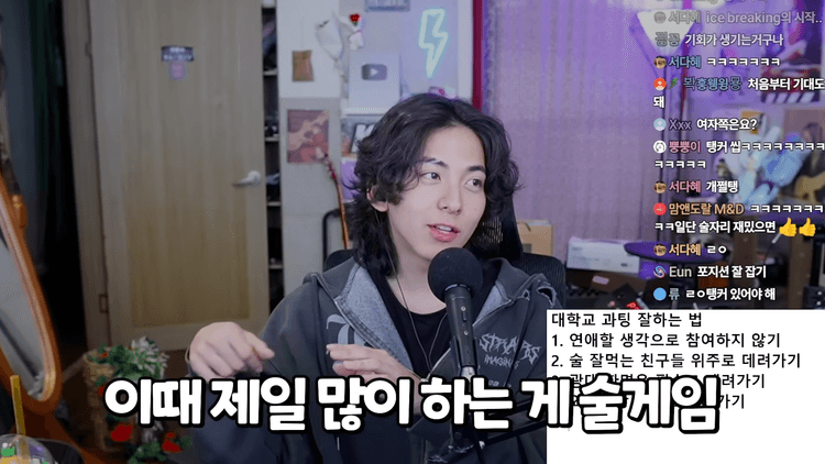 술 게임이 좋은 게 뭐냐면 술을 굉장히 빨리 마실 수 있고, 그리고 서로 진심으로 게임에 임하기 때문에 서로의 성격이나 리액션도 진심으로 보여줍니다. 그래서 더 매력적인 모습들도 많이 볼 수 있어요. 술 게임도 과팅에서 굉장히 중요한 부분입니다.