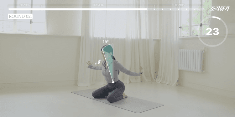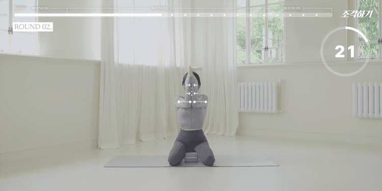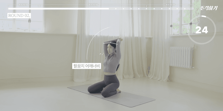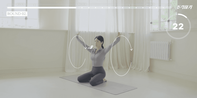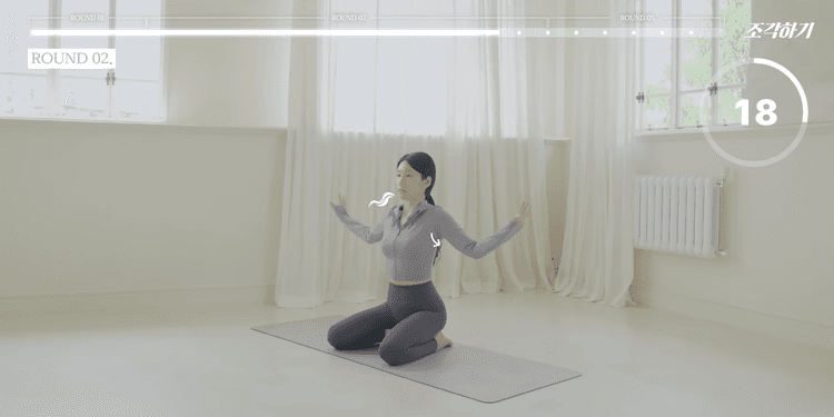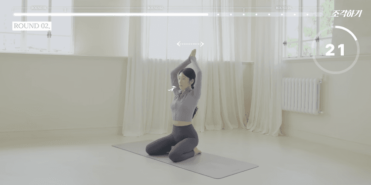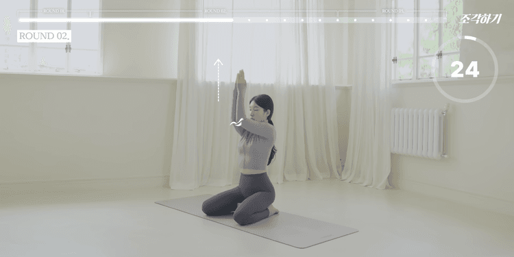 이번 루틴은 총 3라운드로 구성되어 있으며, 1-2라운드는 모든 동작을 앉아서 진행합니다. 쿠션 혹은 요가 블록을 엉덩이 아래에 두고 무릎을 꿇고 진행하는 것을 가장 추천하며, 무릎 꿇기가 불편하다면 양반다리로 진행해도 좋습니다. 모든 동작은 25초씩 진행하며, 동작 내내 턱을 당기고 귓볼, 어깨, 골반을 일직선으로 정렬한 상태에서 아랫배를 쏙 집어넣는 힘을 유지해야 합니다.