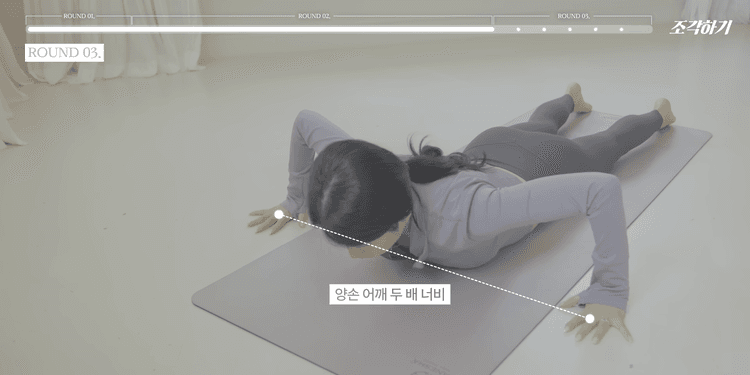 매트에 완전히 엎드려 양발을 어깨 너비로, 양손을 어깨 2배 너비로 어깨 옆에 바닥을 짚고 준비합니다. 그대로 가슴을 매트에서 완전히 띄우고 버팁니다. 모든 손가락으로 바닥을 누르는 힘을 강하게 유지하고, 팔꿈치는 너무 올라가거나 내려가지 않게 어깨-팔꿈치 일직선 정렬을 맞춰줍니다.