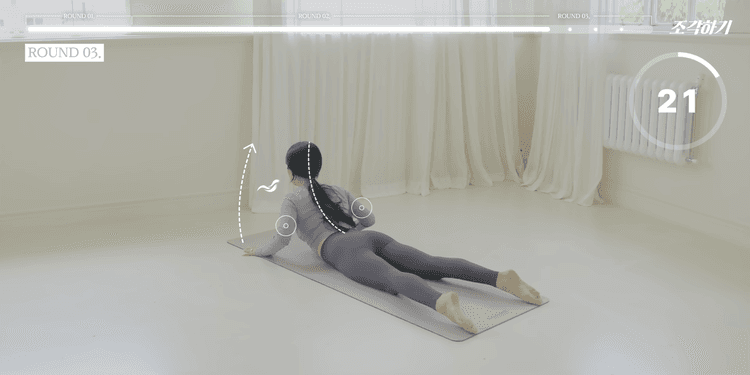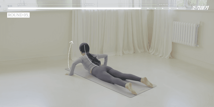 동일하게 상체 업다운을 반복하되, 상체를 올릴 때 허리만 과하게 꺾이는 것이 아닌 목, 등 상부, 등 하부 순서대로 예쁜 커브를 그리며 올렸다 내려줍니다. 상체를 올릴 때는 가슴을 사선 방향으로 최대한 끌어올리는 힘에 집중합니다.