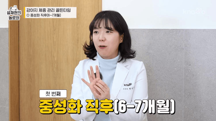 한 10개월에서 1년, 퍼피 사료에서 일반 성견 사료로 바꿔주는 시기입니다. 급성 성장기 때는 필요한 에너지 양이 많기 때문에 그만큼 먹어도 살이 찌지 않습니다. 그런데 그 양 그대로 성견이 됐을 때까지 주면, 급성 성장기가 끝났기 때문에 에너지가 평소보다 조금 덜 쓰이게 됩니다. 그 상황에서 계속 똑같이 먹으면 당연히 여분 칼로리가 생기고 그것이 다 살로 갑니다.