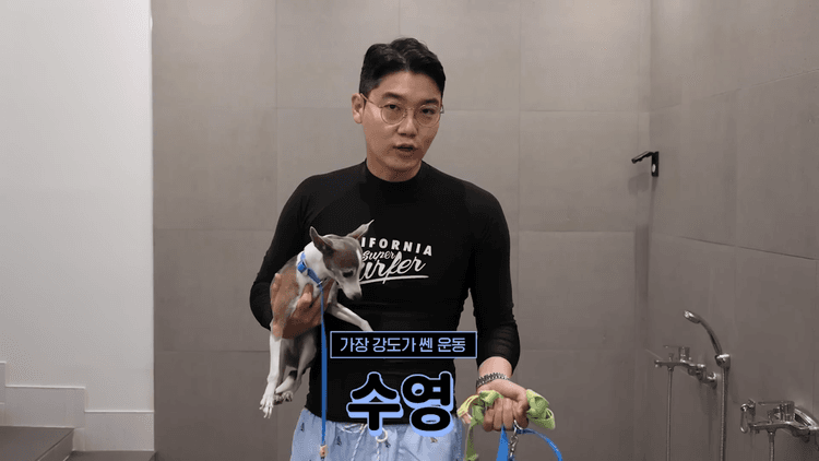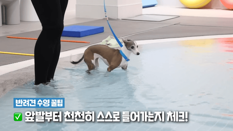 사실 억지로 물에 넣거나 무리하게 수영을 시키면 오히려 트라우마가 생길 수 있다고 해서, 가능한 한 세상이가 스스로 판단하고 움직일 수 있도록 시간을 주고 기다렸습니다. 중간중간 장난감을 던져 유도하거나, 보호자가 함께 물에 들어가면서 불안을 덜어주려 노력했어요.