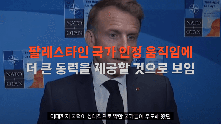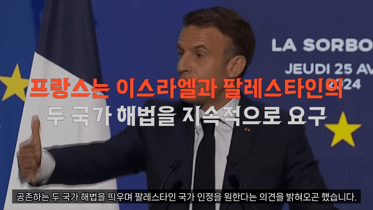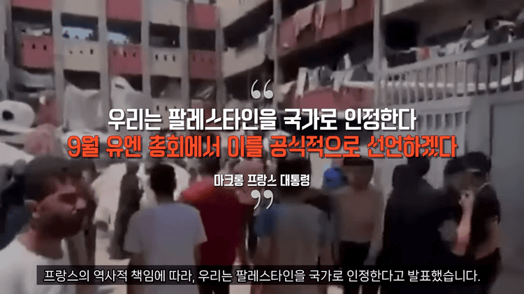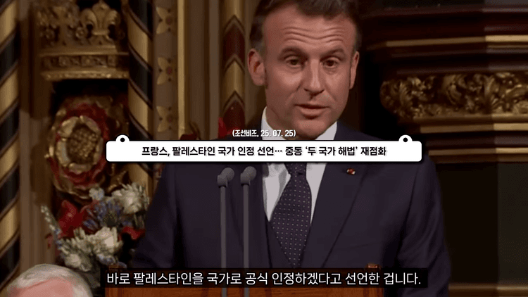 마크롱 대통령은 현지시각 7월 24일 소셜미디어를 통해 "중동의 공정하고 지속 가능한 평화를 위한 프랑스의 역사적 책임에 따라 우리는 팔레스타인을 국가로 인정한다"고 발표했습니다. 그는 오는 9월 UN총회에서 이를 공식적으로 선언하겠다고 밝혔습니다.