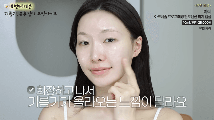 "기름기가 너무 올라와요. 기름기 때문에 미치겠어요"라고 하시는 분들에게는 판토텐산이 답입니다. 제가 잘 쓰는 판토텐산 제품은 아떼의 아크네솔인데, 판토텐산이 20%가 들어가 있어서 거의 피지 박멸기 같은 느낌입니다. 아침에 써주거나 유난히 야외 활동이 많은 날에 써주면 화장하는 것은 똑같은데 화장하고 나서 기름기 올라오는 느낌이 확연히 다릅니다.