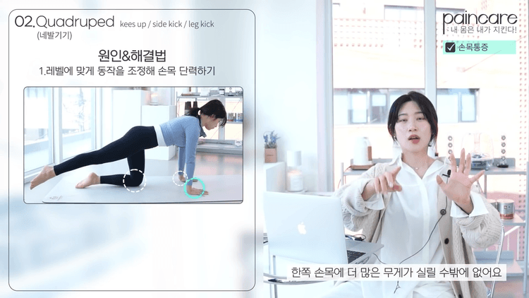 네발기기 자세에서 레그킥을 하는 동작을 많이 하는데, 보통 기본 네발기기 자세는 양손과 양 다리가 무게 중심으로 단단하게 버텨주는데 다리를 드는 순간 한쪽 하체 지지대가 사라지면 한쪽 손목에 더 많은 무게가 실릴 수밖에 없습니다. 예를 들어 오른다리를 빼면 오른손목에 조금 더 많은 무게가 실립니다.