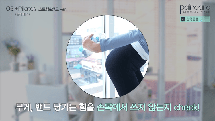 필라테스의 두 번째로 스트랩이나 밴드 사용할 때 손목 아픈 분들은 움직임이 당기다 보면 여성분들한테 특히 손힘 상체 힘이 약해서 손목을 한번 꺾고 당기고 뒤로 당길 때도 손목으로 꺾고 당겨주는 경우가 많습니다.