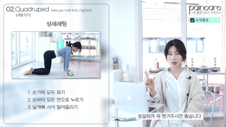 손목 전체의 과부담을 줄이는 것이 가장 중요합니다. 이를 위해서는 버티면서 날개뼈를 밀어주는 힘이 중요합니다. 네발기기도 마찬가지로 이 날개뼈를 꼭 밀어주어야 승모근에 부담이 안 되면서 견갑 안정화도 충분히 되면서 동작을 더 정확하게 할 수 있습니다.