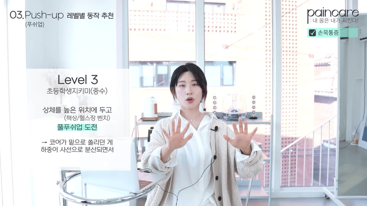우선적으로 모든 통증의 시작은 체형과 습관입니다. 오늘은 이런 깊은 뿌리 원리보다는 누구나 듣고 바로 적용할 수 있도록, "내가 이래서 푸시업 할 때 손목이 자꾸 아팠구나, 이러면 되는구나"라고 바로 알 수 있게 쉽고 간단히 설명드리겠습니다. 비슷한 동작들끼리 묶어서 1차적으로 4가지 동작으로 크게 나누어 보았고, 필라테스에서 스트랩을 잡거나 헬스장에서 아령을 할 때 손목이 아픈 분들을 위한 추가 팁, 그리고 평소에 1분에서 5분만 투자하면 끝나는 데일리 케어법까지 준비했습니다.
