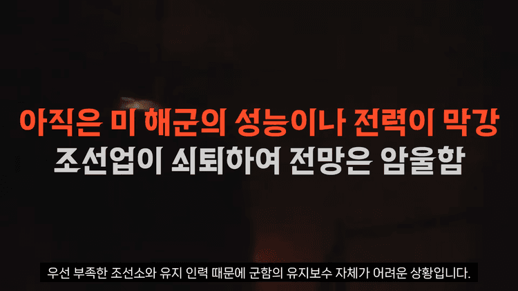 하지만 항공모함 분야에서도 미국의 전망이 그리 밝지는 않습니다. 우선 부족한 조선소와 유지 인력 때문에 군함의 유지보수 자체가 어려운 상황입니다. 이렇게 되면 항공모함과 잠수함이 많이 있어도 운영 능력이 떨어지는 현상이 발생합니다.