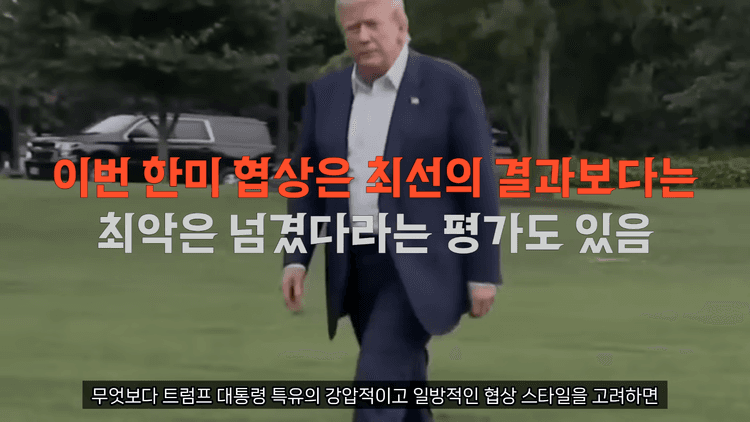 물론 아쉬운 지점도 있지만 무난하게 잘 넘겼다는 평가도 분명히 있습니다. 무엇보다 트럼프 대통령 특유의 강압적이고 일방적인 협상 스타일을 고려하면, 이번 한미 협상은 최소한 최악의 시나리오를 피했다는 점에서 의미가 있다는 분석이 나옵니다.