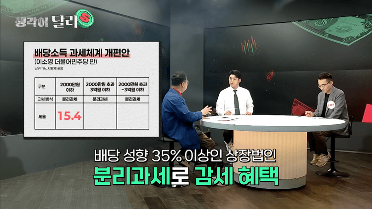 최고민수님은 현재 정부가 추진하고 있는 배당소득 분리과세 정책에 주목하셨습니다. 배당 소득이 2천만 원 이하는 현행처럼 15.4%의 세율을 적용하지만, 2천만 원 초과 3억 원 이하는 22%, 3억 원 초과 시에는 27.5%의 세율을 적용한다는 내용입니다.