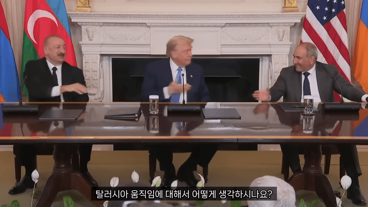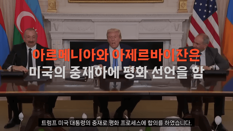 최근 트럼프 대통령이 아르메니아와 아제르바이잔 장관의 중재에 성공했습니다. 트럼프 대통령은 아제르바이잔 일함 알리에프 대통령과 니콜 파시냔 아르메니아 총리를 워싱턴 DC에 초청하였습니다. 그리고 이 자리에서 양국 간의 분쟁의 평화적 해결에 관한 공동 선언에 서명하였습니다.