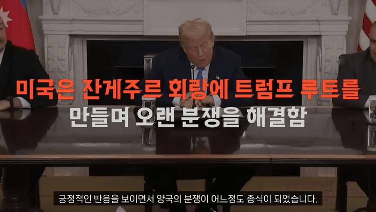 이번에 트럼프 대통령이 양국 간 분쟁 문제를 어느 정도 해결하였습니다. 트럼프 대통령은 양국 정상을 데리고 와서 공동 선언을 했는데, 이 선언을 통해 잔게주르 회랑의 통로 하나를 만들게 되었습니다. 이 통로의 이름은 '국제 평화와 번영을 위한 트럼프의 길'이라고 명명되었으며, 이 글에서는 '트럼프 루트'라고 부르겠습니다.