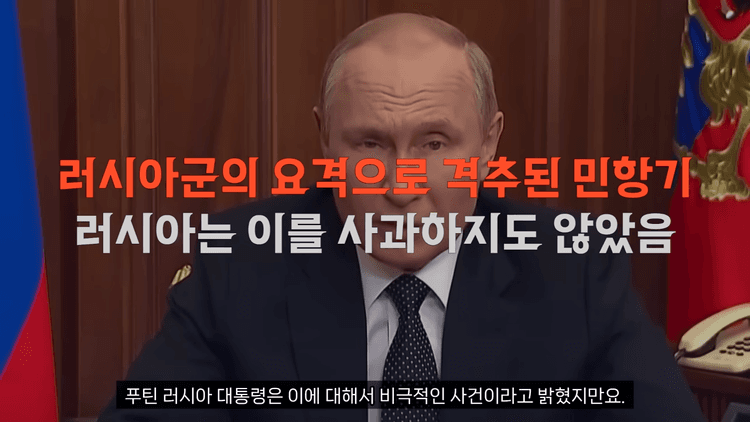 러시아군의 방공 시스템 오류로 인해서 지대공 미사일이 발사되었다고 밝혔습니다. 당시 우크라이나군이 드론 공격을 이 지역에 시도했던 터라 러시아군은 방공 무기를 운영하고 있었는데 민항기를 오인 격추했다고 합니다. 푸틴 러시아 대통령은 이에 대해서 "비극적인 사건"이라고 애도했지만, 책임을 인정하지는 않았습니다.