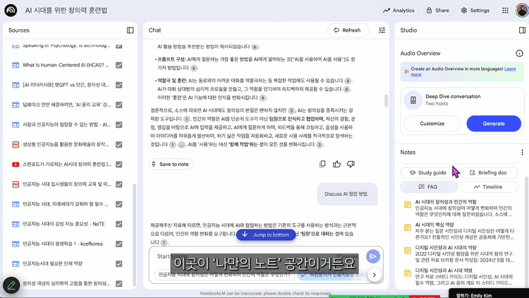 즉각적인 통찰력 기능으로는 스터디 가이드(요약), 브리핑, FAQ(퀴즈), 타임라인(연도별 정리) 등이 있습니다. 대학생들이 요새 ChatGPT보다도 NotebookLM을 더 많이 쓴다고 합니다.