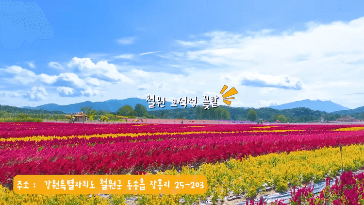 가을하면 빠질 수 없는 매력적인 곳인 철원 고석정 꽃밭으로 떠나가 보겠습니다. 작년에 정말 많은 분들이 이 아름다운 풍경을 보기 위해서 철원 고석정 꽃밭을 방문했습니다. 올해는 개장을 이미 시작했고, 맨드라미는 이와 같은 풍경을 볼 수 있지만 아직 다른 꽃들은 이르기 때문에 개인적으로 추천하는 방문 시기는 9월 말이나 10월 초입니다.