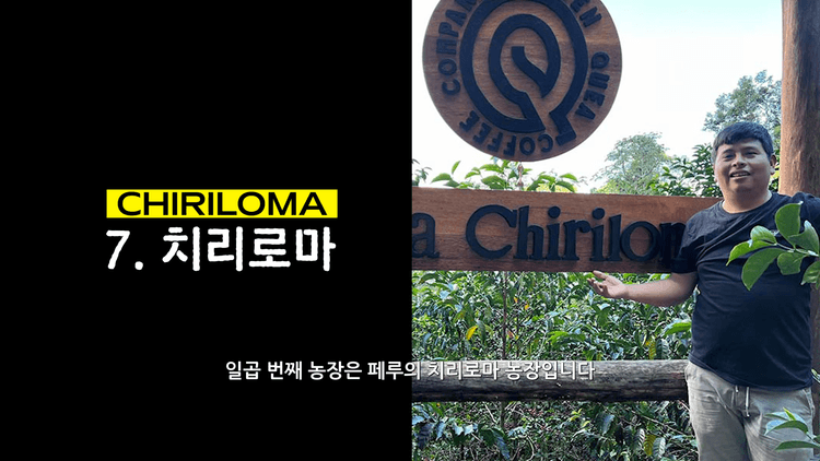 일곱 번째 농장은 페루의 치리로마 농장입니다. 오늘 말한 농장들 중에서 네임밸류는 조금 떨어질 수도 있지만, 한국에 있는 송호석 교수님과 협업을 해서 만들어진 커피로 조금 한국에서 유명세를 띠기 시작했습니다.