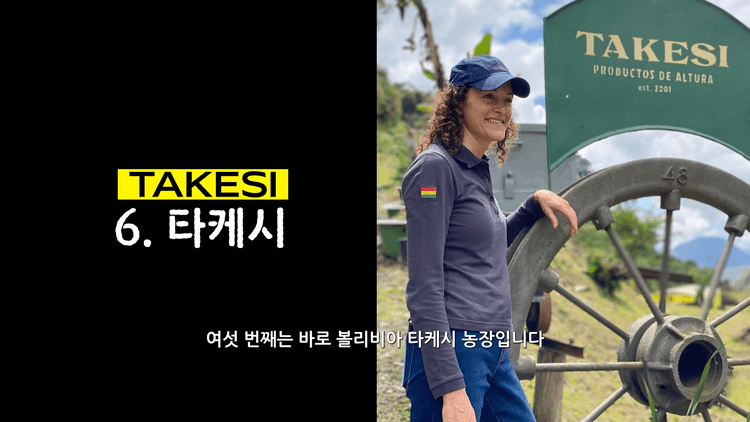 여섯 번째는 볼리비아 타케시 농장입니다. 솔직히 말하면 볼리비아에도 정말 좋은 농장이 많이 있고 숨겨진 농장도 많이 있는 것 같습니다. 사실 마실 기회가 그렇게 많지 않은 이 농장을 추천할까 말까 고민했지만, 그럼에도 불구하고 많은 로스터들이 열광하고 많은 분들이 신비롭게 여기는 곳이 이 타케시이기 때문에 추천하고 싶었습니다.