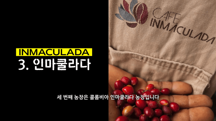 세 번째 농장은 콜롬비아 인마쿨라다 농장입니다. 2010년부터 정말 오랜 경력을 가진 홀구인 가문이 오랜 시간 동안 커피를 해오다가 스페셜티 커피에 도전하고자 만든 농장입니다.