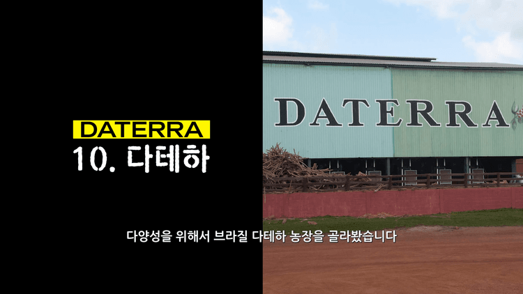 10번째 농장은 사실 정말 고민을 많이 했는데, 다양성을 위해서 브라질 다테하 농장을 골라봤습니다. 방문한 적이 없는 곳이기도 하고 깊이 있게 이해를 하고 있지는 않지만, 커피를 시작할 때부터 정말 유명했었고, 이 농장이 만들어온 어떤 문화나 커피들의 색깔들이 브라질에서는 독보적이라고 할 수 있을 것 같습니다.