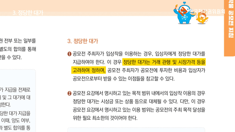 그럼 정당한 대가를 어떻게 결정하면 될까요? 한국저작권위원회의 창작물 공모전 지침에 따르면 거래 관행 및 시장 가격을 고려해서 결정하도록 하고 있습니다. 물론 입상자의 경우에는 본인이 입상을 했으니까 그 공모전으로부터 얻는 이점도 있을 것이고 또 공모전 주최자가 공모전을 여는 데 투자한 비용도 있을 것입니다. 그런 부분들을 복합적으로 고려해서 결정하면 됩니다.