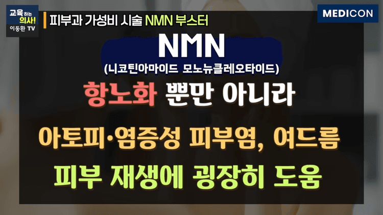 NMN은 항노화뿐만 아니라 아토피 피부염, 염증성 피부염, 여드름, 피부 재생에 탁월한 효과를 보입니다. 실제로 시술받은 의사는 "어두운 연습실에서 전신 거울을 봤는데 이마가 반짝반짝 빛이 났다"며 그 효과를 증언했습니다.