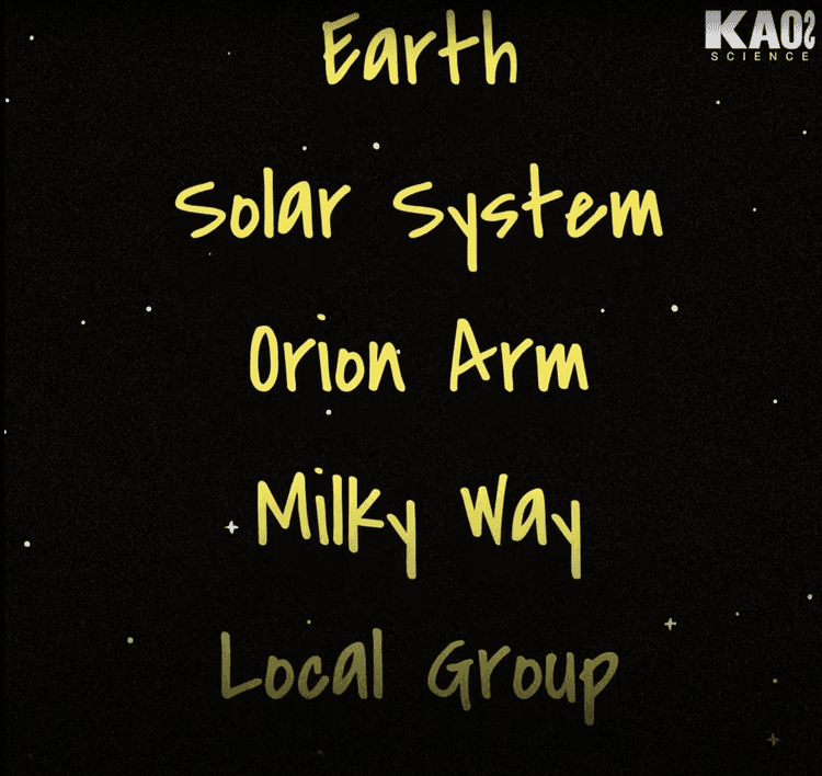 태양계 → 우리은하 → 국부은하군 → 처녀자리 초은하단 → 라니아케아 초은하단