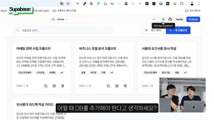 슈퍼베이스 프로젝트를 "프롬프트 마스터"라고 만들고 러버블과 연결했습니다. 데이터베이스에 대한 구조에 대한 이해 없이도 할 수 있다는 게 정말 놀라웠습니다. 노코드로 했을 때는 에어테이블을 어떻게 설계해야 되는지가 진짜 골치 아픈데, 이 부분을 커서나 러버블 같은 도구들은 인테그레이션을 통해서 해결해 줍니다.