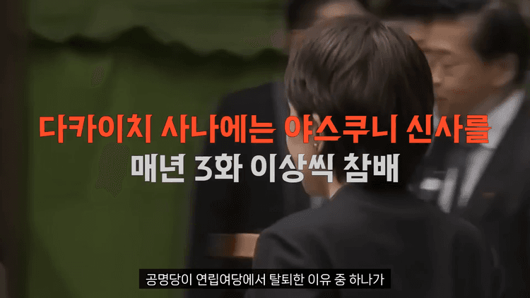 다카이치 사나에 총리를 유심히 봐야 합니다. 다카이치 사나에는 강경 보수 성향으로 평가받고 있습니다. 굉장히 강경한 태도를 보이고 있습니다. 다카이치는 제2차 세계대전 A급 전범이 합사된 야스쿠니 신사를 매년 최소 3회씩 참배하는 사람입니다. 공명당이 연립 여당에서 탈퇴한 이유 중 하나가 다카이치의 과도한 야스쿠니 신사 참배 때문이기도 합니다.