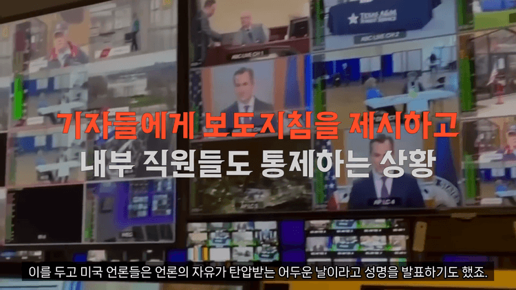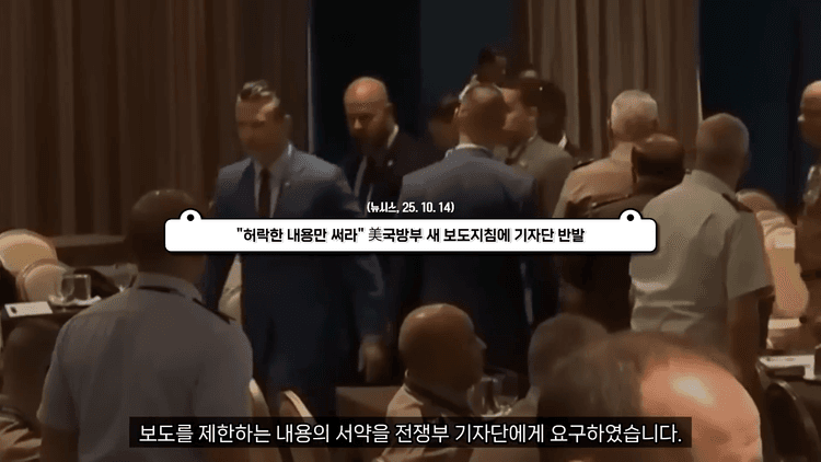 근데 이 정부는 언론 길들이기를 진행하고 있는 모습입니다. 피트 헤그세스 미국 국방부 장관은 현지시각으로 10월 13일에 미승인 정보에 대한 보도를 제한하는 내용의 서약을 국방부 기자단에게 요구했습니다. 보도 지침을 준수하겠다는 서약서를 쓰라고 말한 것이었습니다.