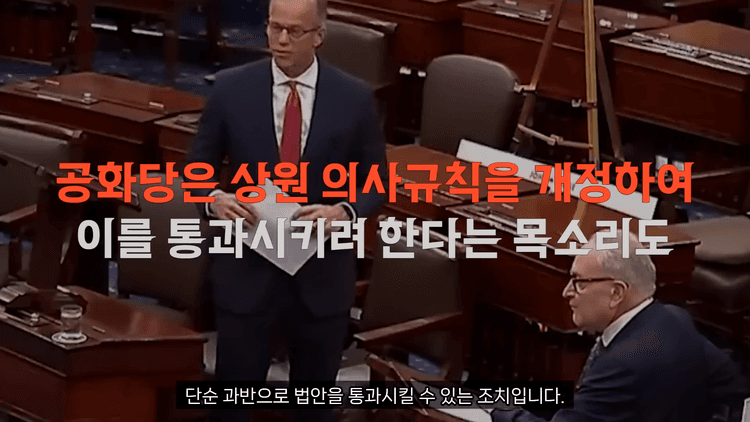 그렇다 보니 공화당 내에서는 상원 예산안 통과에 필요한 60표 기준을 없애는 핵옵션 발동이 거론되고 있습니다. 이 핵옵션이라는 것은 상원 의사규칙을 임시 개정해서 단순 과반으로 법안을 통과시킬 수 있는 조치입니다.
