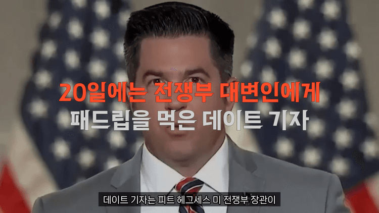 데이트 기자는 피트 헤그세스 국방부 장관이 미국과 우크라이나 간 정상회담에서 러시아 국기와 같은 색깔의 넥타이를 착용한 것에 대해 질문하니까, 커널 국방부 대변인이 "네 엄마가 사줬다"고 답했습니다. 패드립을 정부 주요 보직자에게 두 번이나 먹은 겁니다.