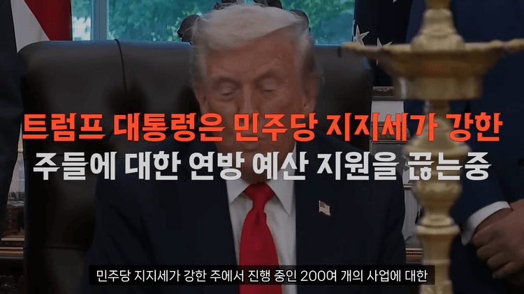 다만 트럼프 대통령은 이걸 노리고 하는 모습입니다. 트럼프 행정부는 의회에서 예산안이 통과되지 않으니까 민주당 지지세가 강한 주에 대한 연방 예산 지원을 끊고 있는 모습입니다. 트럼프 행정부는 민주당 지지세가 강한 주에서 진행 중인 200여 개의 사업에 대한 약 40조원 규모의 연방 예산 지원을 중단했습니다.