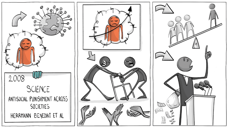 2008년 사이언스지에 반사회적 처벌 현상을 16개국에서 관찰한 연구가 발표됩니다. 그에 따르면 반사회적 처벌이 더 강한 나라일수록 이기적인 행동이 장려되고 사회적 불평등이 심하고 정부는 부패해 있었습니다.